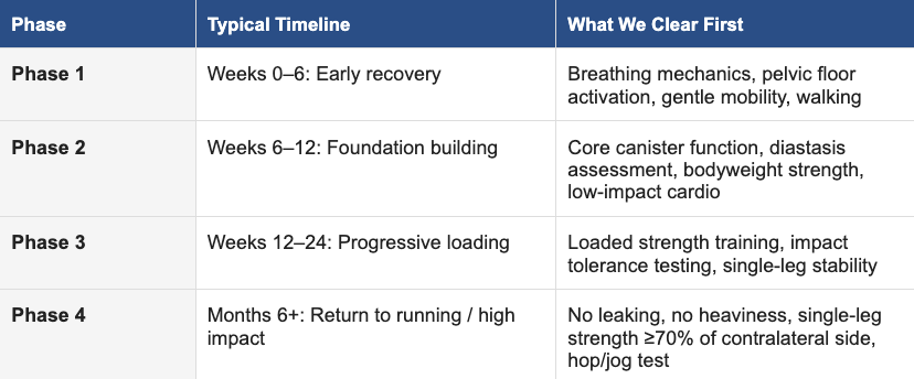 Returning to running before these criteria are met doesn't just risk short-term discomfort — it increases the likelihood of stress urinary incontinence, pelvic organ prolapse progression, and musculoskeletal injury from a body that hasn't yet rebuilt its structural foundation.