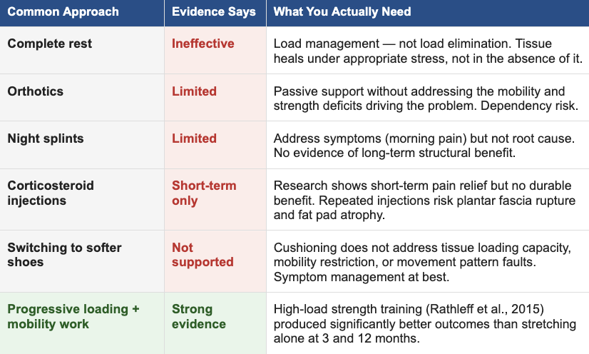 The corticosteroid data deserves particular attention. A systematic review by Coombes et al. (2010) published in The Lancet examining corticosteroid injections across musculoskeletal conditions found that while injections produced superior short-term pain relief, they were associated with worse outcomes at intermediate and long-term follow-up compared to placebo. For the plantar fascia specifically, repeated injections carry documented risk of fat pad atrophy and fascia rupture — a meaningful complication in an already compromised structure.